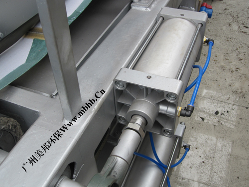 张紧装置的作用是张紧上、下滤带,通过主传动辊带动所有辊子运转,并使之向滤饼施加一定的挤压力和剪切力而脱水,本机采用带缓冲气缸张紧,通过调节气压大小来控制张紧力。