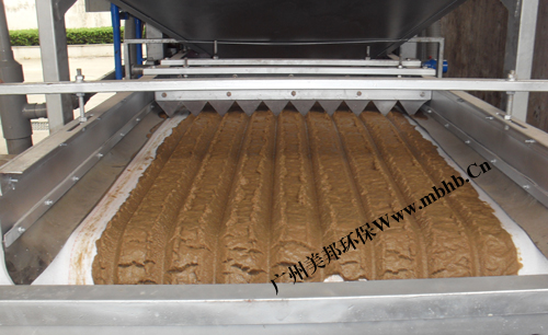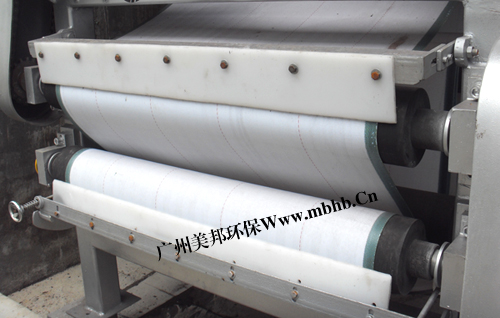 重力脱水装置的主要作用是脱去物料中的自由水、间隙水,使物料的流动性减小,为下一步压滤作准备,其结构在设计上分为独立滤网重力脱水(即浓缩机),再加上上、下层压滤网两层的重力脱水,经过6-11米较长的重力脱水,污泥中的大量自由水被充分滤除,此时污泥可承受较大挤压力。