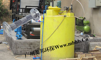 本机采用非阻塞型静态混合器(不易絮凝的物料采用搅拌动态混合器),用于混合污泥和化学药液,它被安装于污泥布料槽之前,可以将絮凝剂从四周高压注入污泥管后进入混合反应器,可使污泥颗粒与稀释后的聚合电解质溶液迅速进行碰撞接触,通过调节污泥与药液的流量以达到较佳絮凝效果和脱水效果。