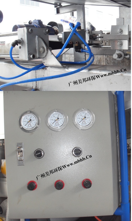 整个污泥脱水工作系统由一套配电控制柜(手动触点控制或PLC控制器)统一操作控制,电控柜为主机及其配套设备——污泥泵、清洗水泵、搅拌机、药液泵、空压机、输送机等设备提供电源、启动、停止及电机的短路、过热/过载、缸相的控制保护和报警。